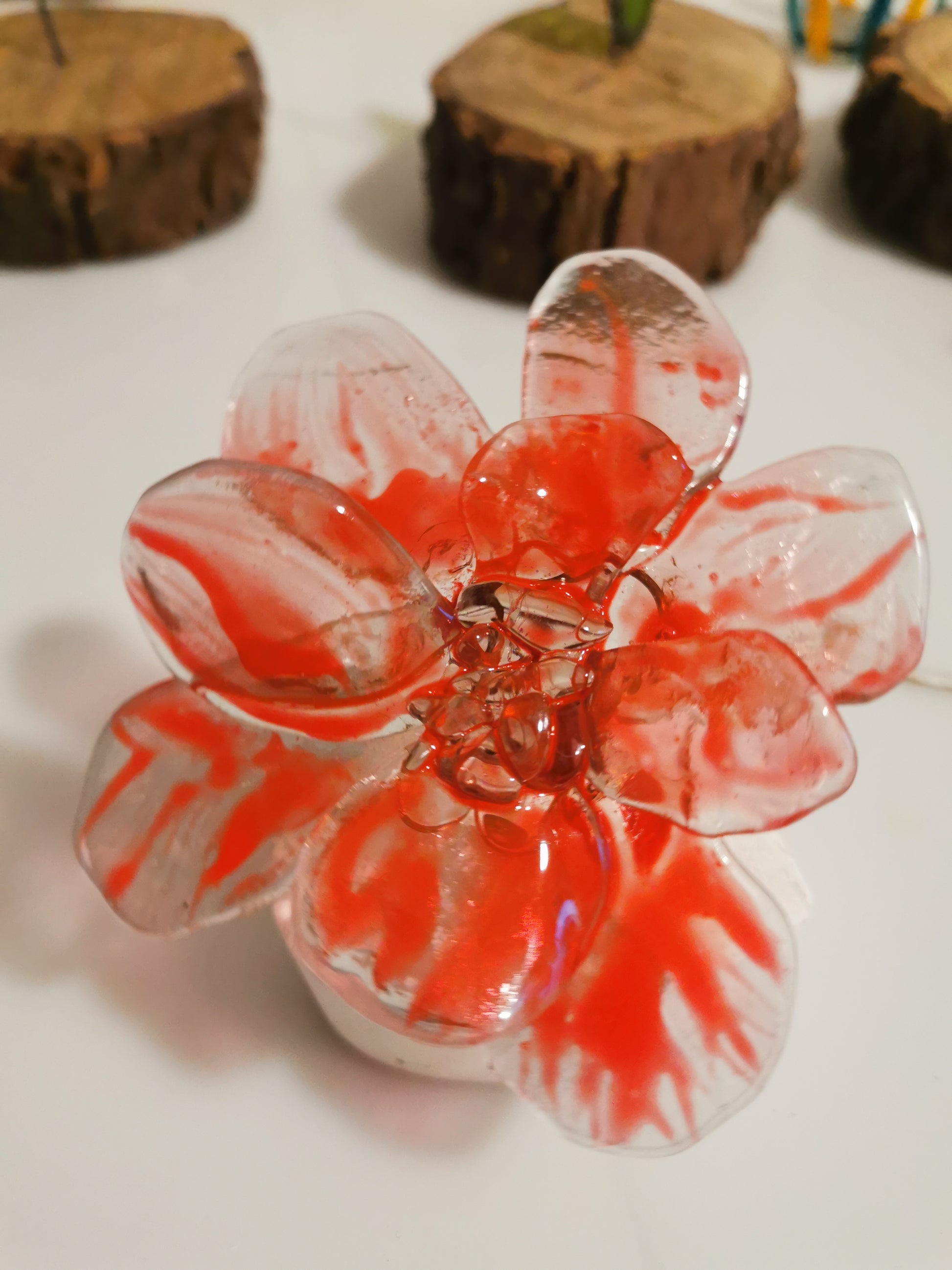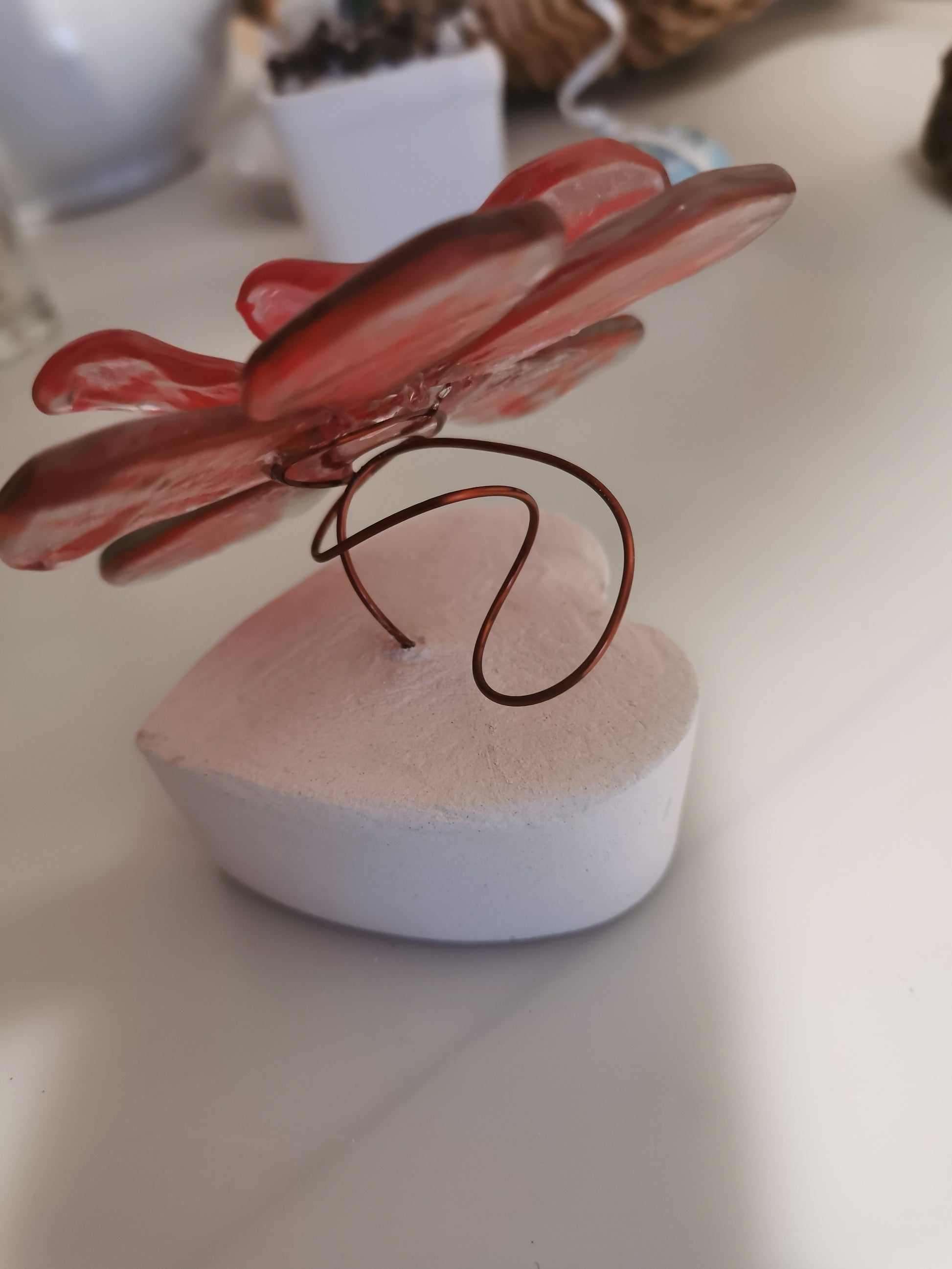 Corazón de cemento con rosa movible de vidrio pintado.
