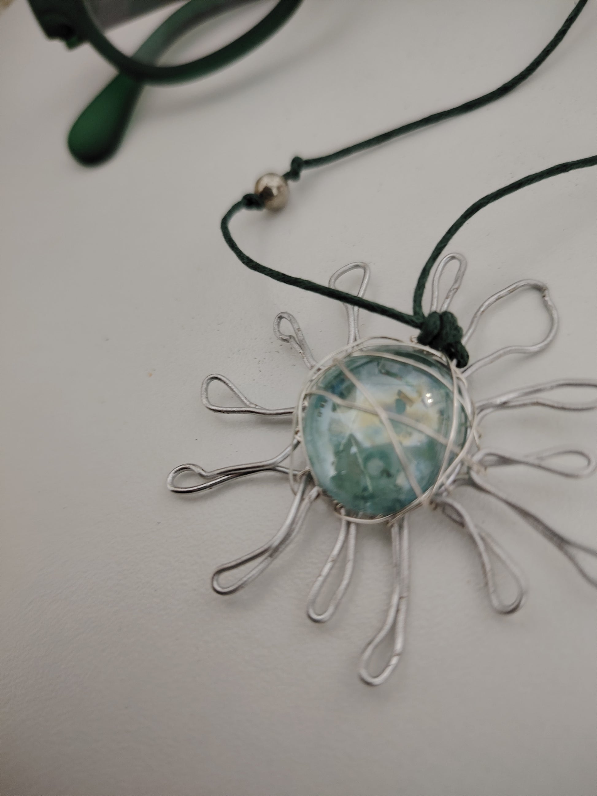 Dije de esfera de vidrio engarzado en alambre, con cordón a tono.