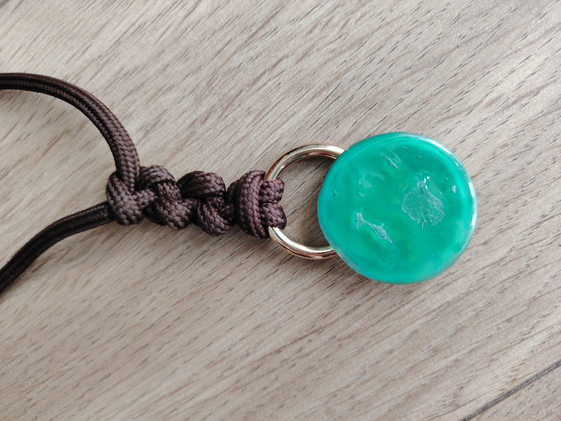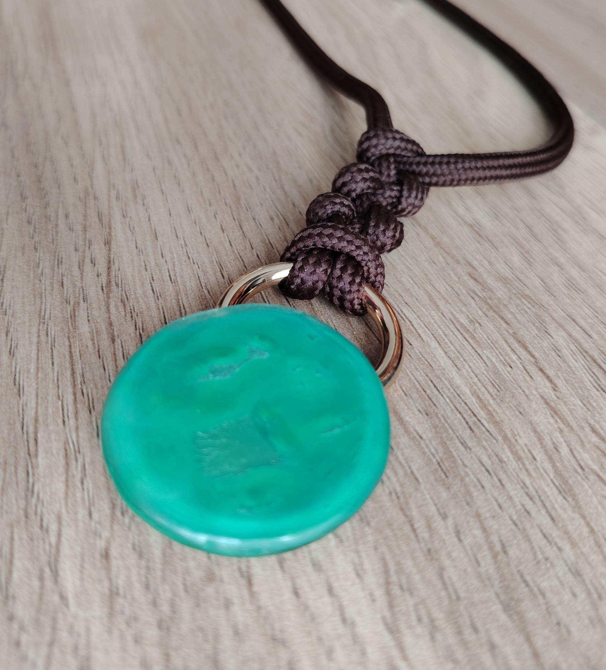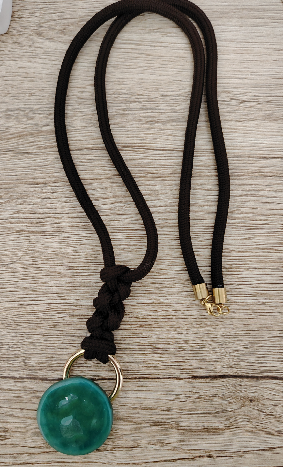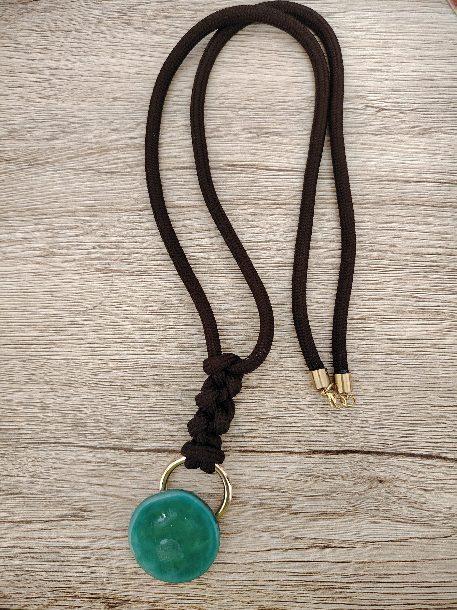 Colgante con cordón marrón largo regulable, con accesorios dorados y esfera de vidrio.